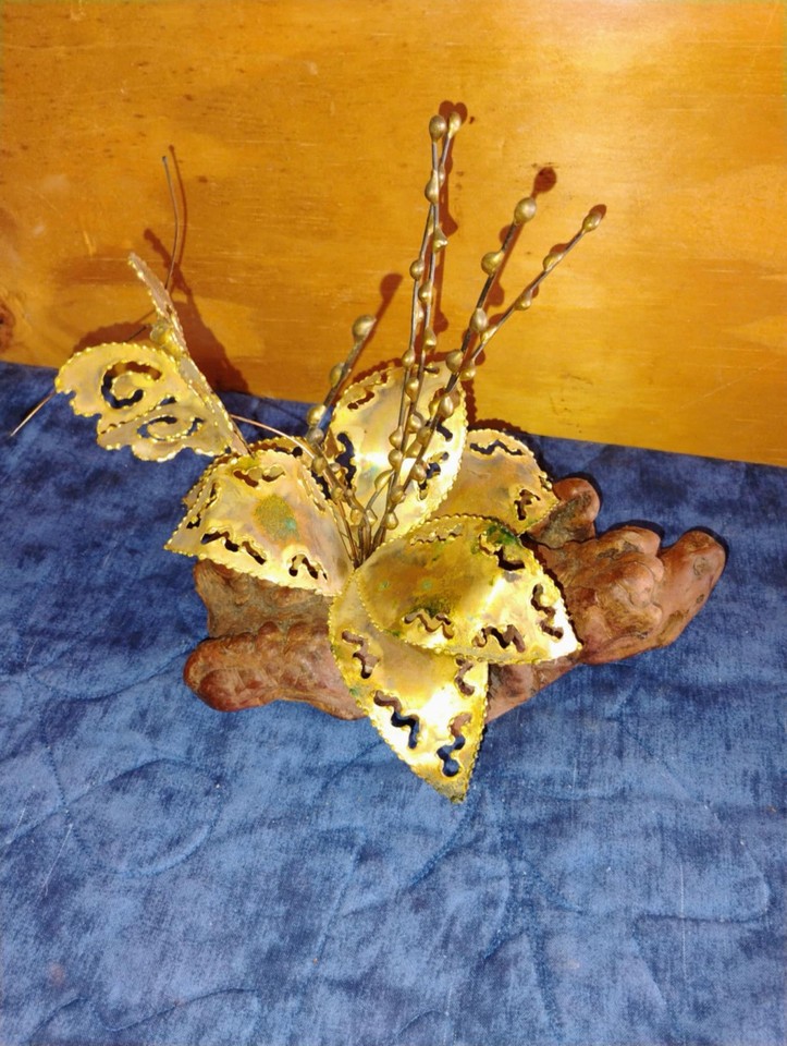 Brutalistische Kupfer Messing Schmetterling Blume auf Wurzelholz Vintage/Retro-