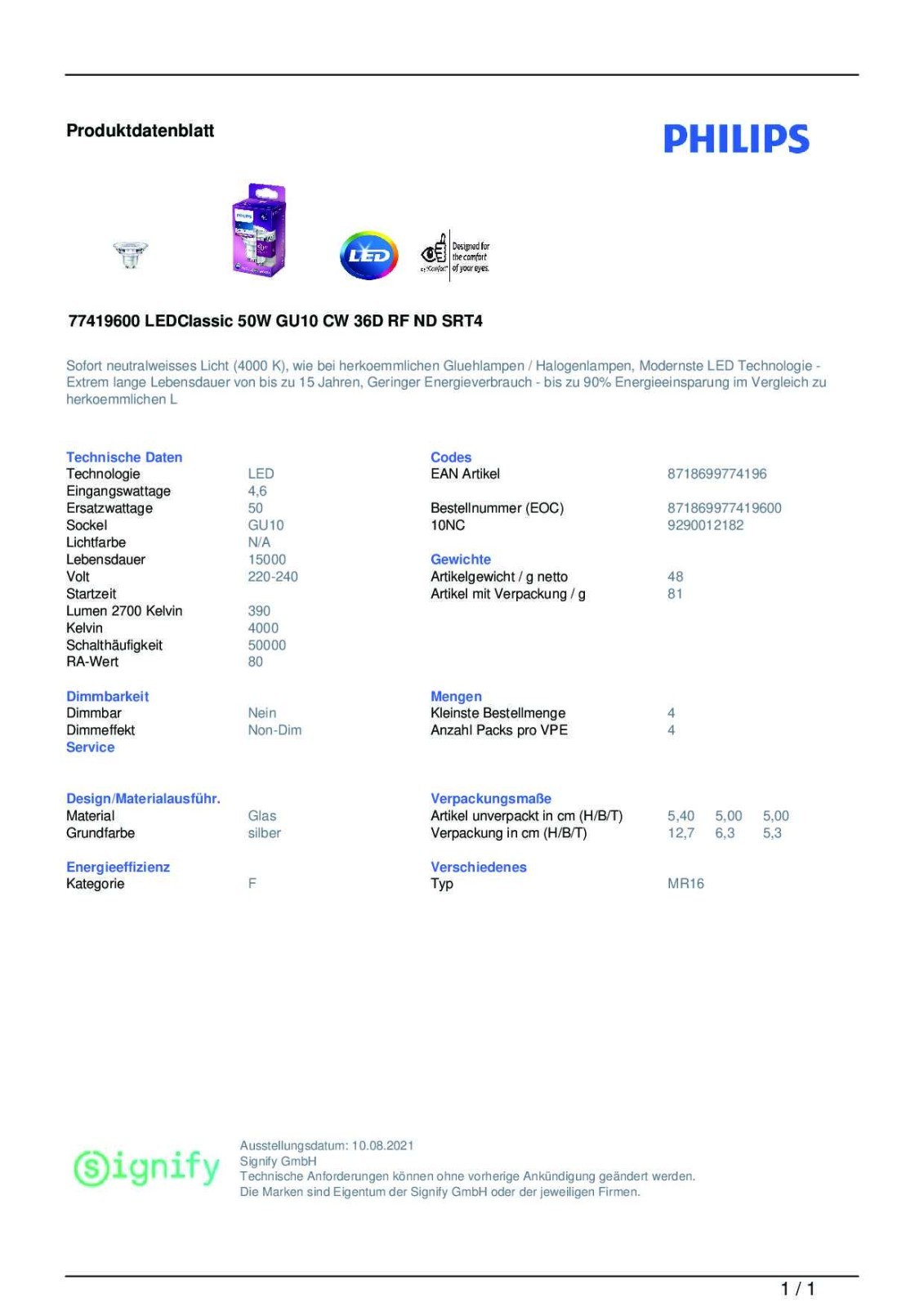 Philips LED Leuchtmittel Glas Reflektor 4,6W = 50W GU10 390lm Neutralweiß 4000K