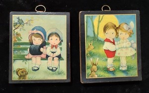 2er Set Mini Wandhänger Junge & Mädchen auf Bank / Junge & Mädchen im Mondschein 60er Jahre?