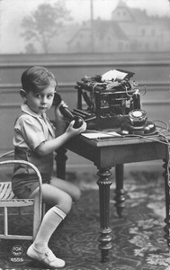 AK Foto Junge alte Schreibmaschine Telefon Periode tragen Kniestrümpfe