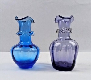 Vintage Hand Blown Blue & Purple Art Glass Ruffled Top Ribbon Trim Mini Vases EUR 17,07Bisher: EUR 21,34