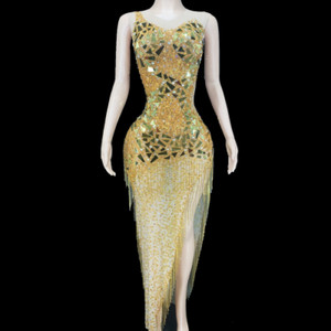 Glitzerndes Gold Spiegel Strass Fransen Damen Kleid Sexy Split Party Outfit