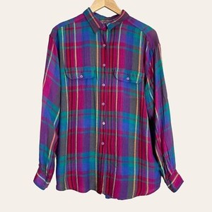 Vintage kariertes Viskose Hemd Damen Knopfleiste Bluse Top Paris Sport Club weich Lrg
