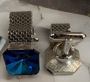 Herren Blau Geometrisch Glas & Silber Ton Wickel Manschettenknöpfe Vintage